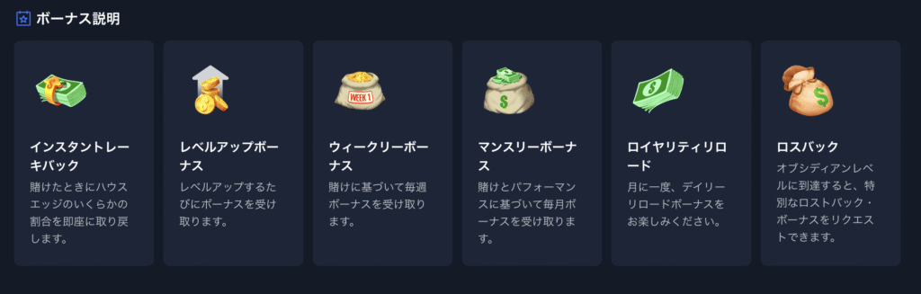 VIP制度も非常に充実しており、最大75%還元のVIP Rewards Systemをはじめ、上位ランクには専属VIP Host制度やハイローラー向けのLossbackが用意されています。